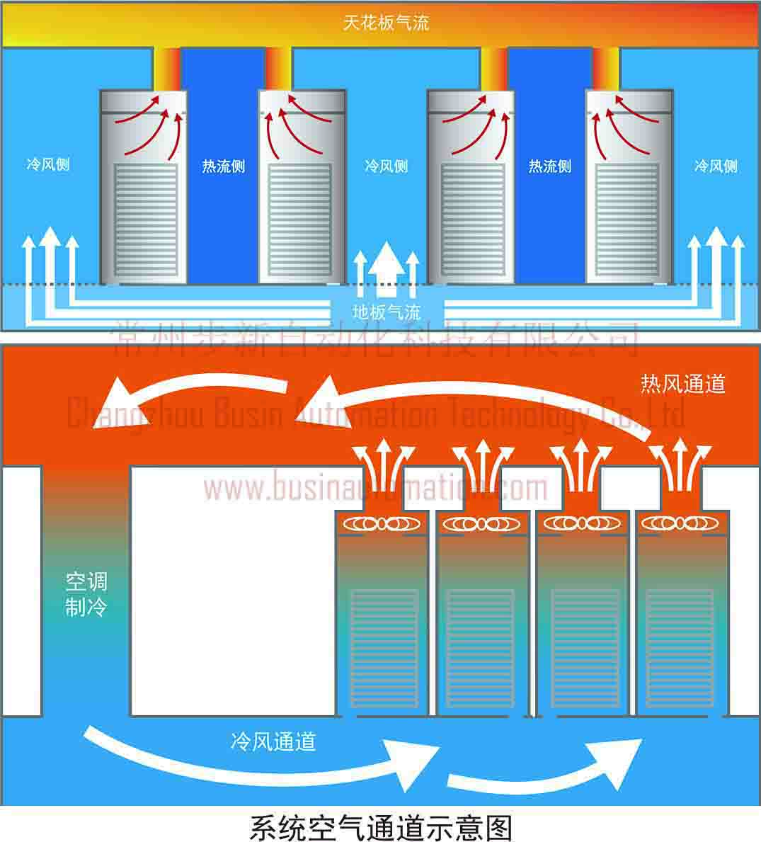 设备从前侧吸入冷风,在内部与发热部件热交换后向后排出带走热量,排风系统从机柜内抽出热空气并通过顶部的通风管道送回空调机。系统并不以机柜后部的温度作为控制参数,而是尽量让设备的排风量和机柜的进风量保持一致。排出的热风不会和机房内的冷风混合,在机房内所有的开放空间都成为冷风通道,制冷设备的温度无需过低,也不会导致送风压力的衰落。