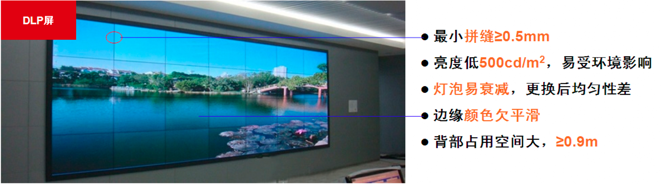 但DLP背投拼接由于本身特性,存在较为明显的缺点,屏体越大,就会出现色彩与亮度不均匀情况,且内部发光灯泡在连续工作6000-8000小时后,会出现亮度降低情况。为了保持较好显示效果,在应用后期需更换灯泡,因此,维护成本是非常大。此外,由于DLP拼接单元厚度大,还需在屏体背部留下足够空间,这对于一些空间较小安装场所是一个问题。