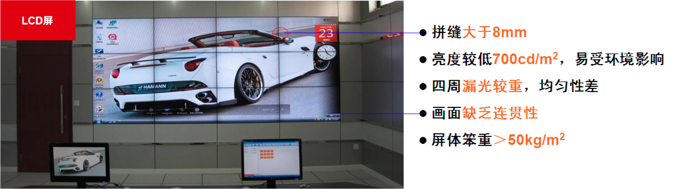 LCD液晶拼接是继DLP拼接、PDP拼接之后,近几年兴起的一项新的拼接技术,LCD液晶拼接墙具有低功耗、重量轻、寿命长(一般可正常工作5万小时)、无辐射、画面亮度均匀等优点,但其最大的缺点就是无法无缝拼接,这对于显示画面细致和连贯的行业用户来说,是一个较大的硬伤。
